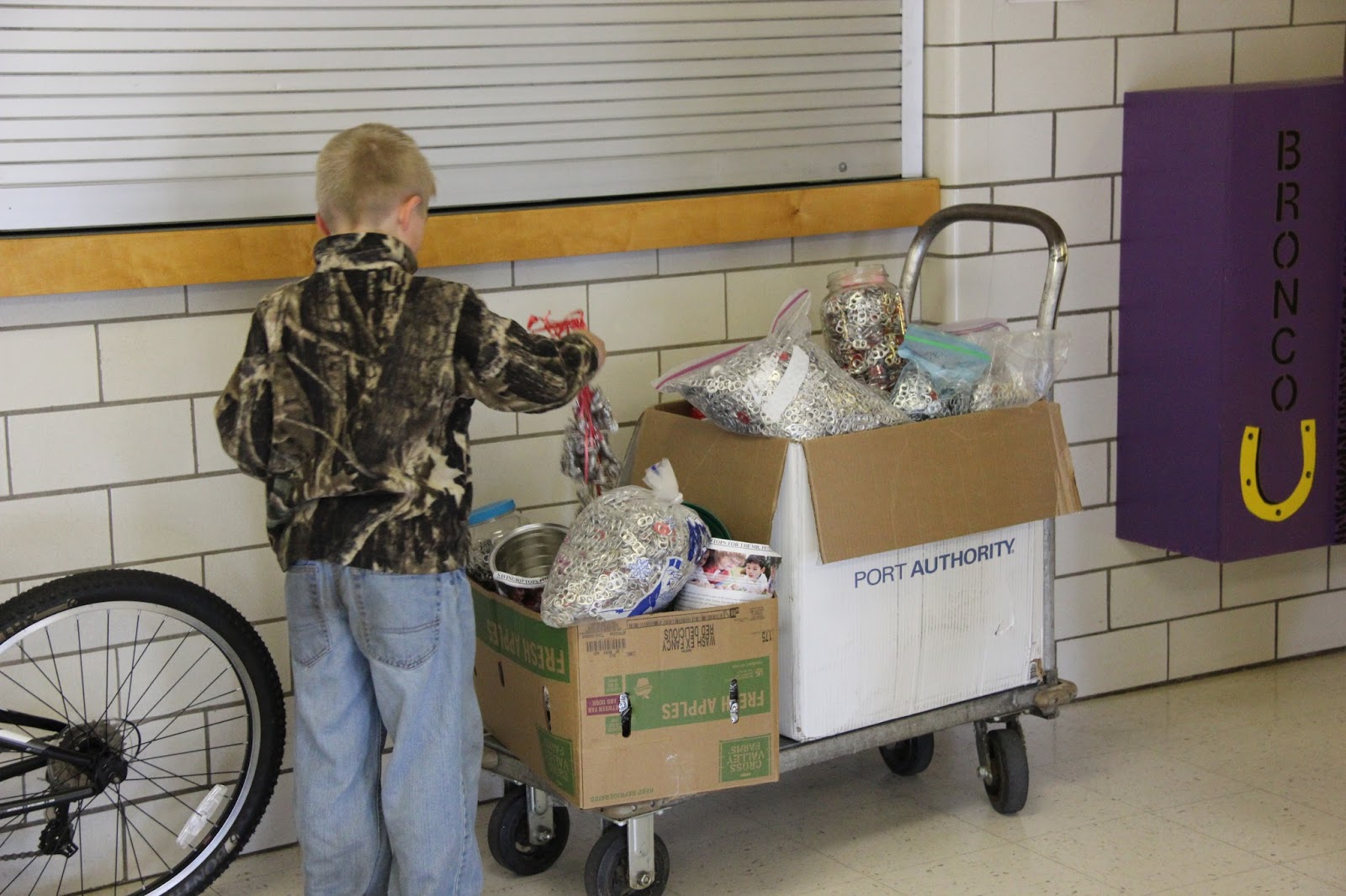 Mr. Ohlquist told us there are 1,336 tops in a pound. That's 17,500 pop tops that Emmitt brought in! Crazy! We don't even drink pop!