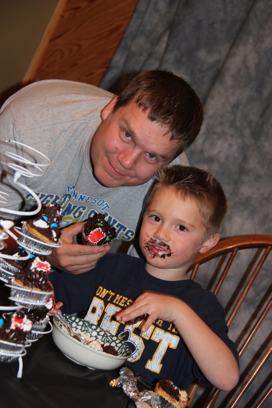 The 3rd batch of werewolf cupcakes turned out even better. I did take the easy way out and cut off at 2 dozen for the party and plainly decorated the rest. We managed to shove 6 candles on one and as we sang to you, you did something you have never, ever done. You played shy or embarrassed and ducked under the table until we finished. I have no idea why. It's so not like you. But when we finished, you came up and blew out all your candles and the moment passed you.